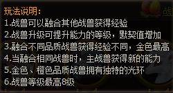 大家看到了第一个就是爪击,爪击下面那个就是第一个融合后获得的绝招,右上角那个类似于魂侍盾的被动技能,右下角那个就是光环了。战兽等级达到3级时技能就会升到2级,但是否是每2级升1级技能,现在暂时没法测试,因为3级后等级提升将非常困难,就算用金色融合经验也不多。另外,等级的提升还会增加一个叫默契值的属性,默契值越高继承主角属性的比例也就越高,接下去让大家看下各个战兽的绝招及光环。