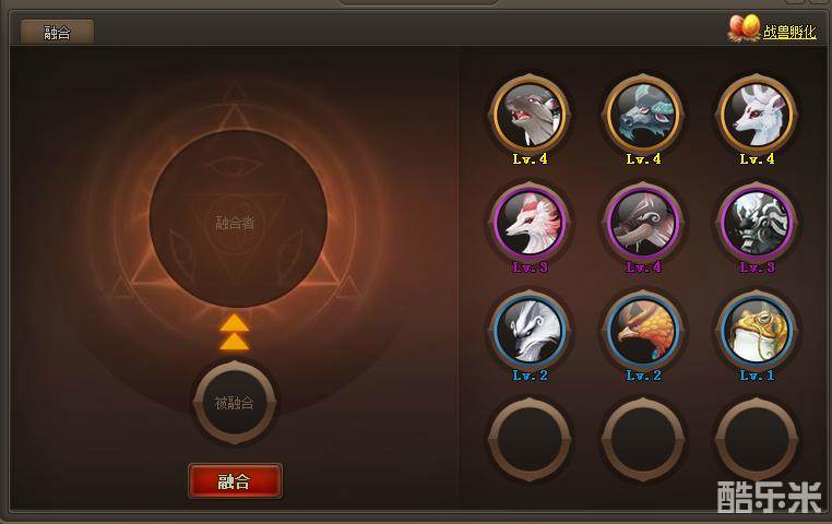 每个战兽的初始技能都是爪击,随着等级的提升技能等级也会提升,蓝色和紫色都是有3种技能,除了初始的爪击外,另2个都是通过融合相同的战兽获得,金色的除了3个技能外另一个是光环,需融合的战兽也比蓝的和紫的要多1个,目前也只有金色战兽有光环,请见图: