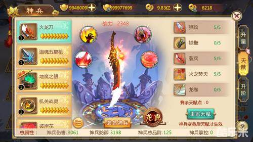 分析:火龙刀强调伤害,而防御加成比较适合刀客,每个神兵上限有15个天赋点,而每个天赋五点可以点满,这时候如果取舍就要看本身的职业和对属性的需求了。