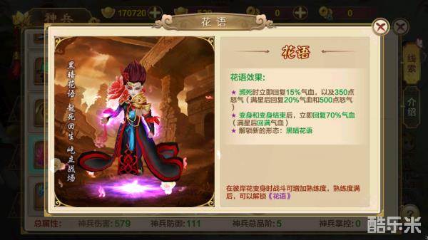 基本属性中,神兵伤害最高的神兵,但是天赋和花语表明这个神兵更倾向于辅助输出,变身满血,解除变身还是满血,血量危险的情况下一发变身就会让敌人感到绝望