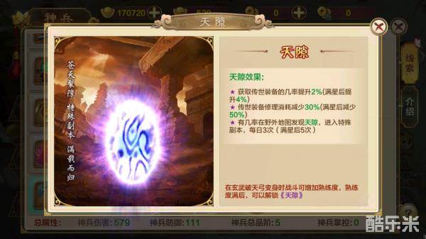 熟练度满后开启【天隙】技能,可以增加获取传世装备的概率、降低修理传世装备的费用,以及有几率在野外出发特殊副本!