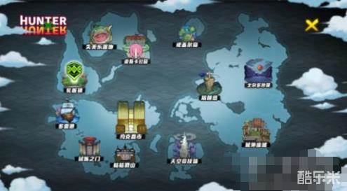 当前地图共分为12块,分别为:失美乐湿地、皮斯卡公园、戒备尔岛、陷阱塔、戈尔多沙漠、城外废墟、天空竞技场、约克鑫市、枯枯戮山、试练之门、多雷港、轧版镇。
