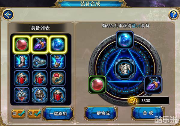 ☆必须放置3件装备合成,同品质100%提升1个品质,最高能合出橙装;