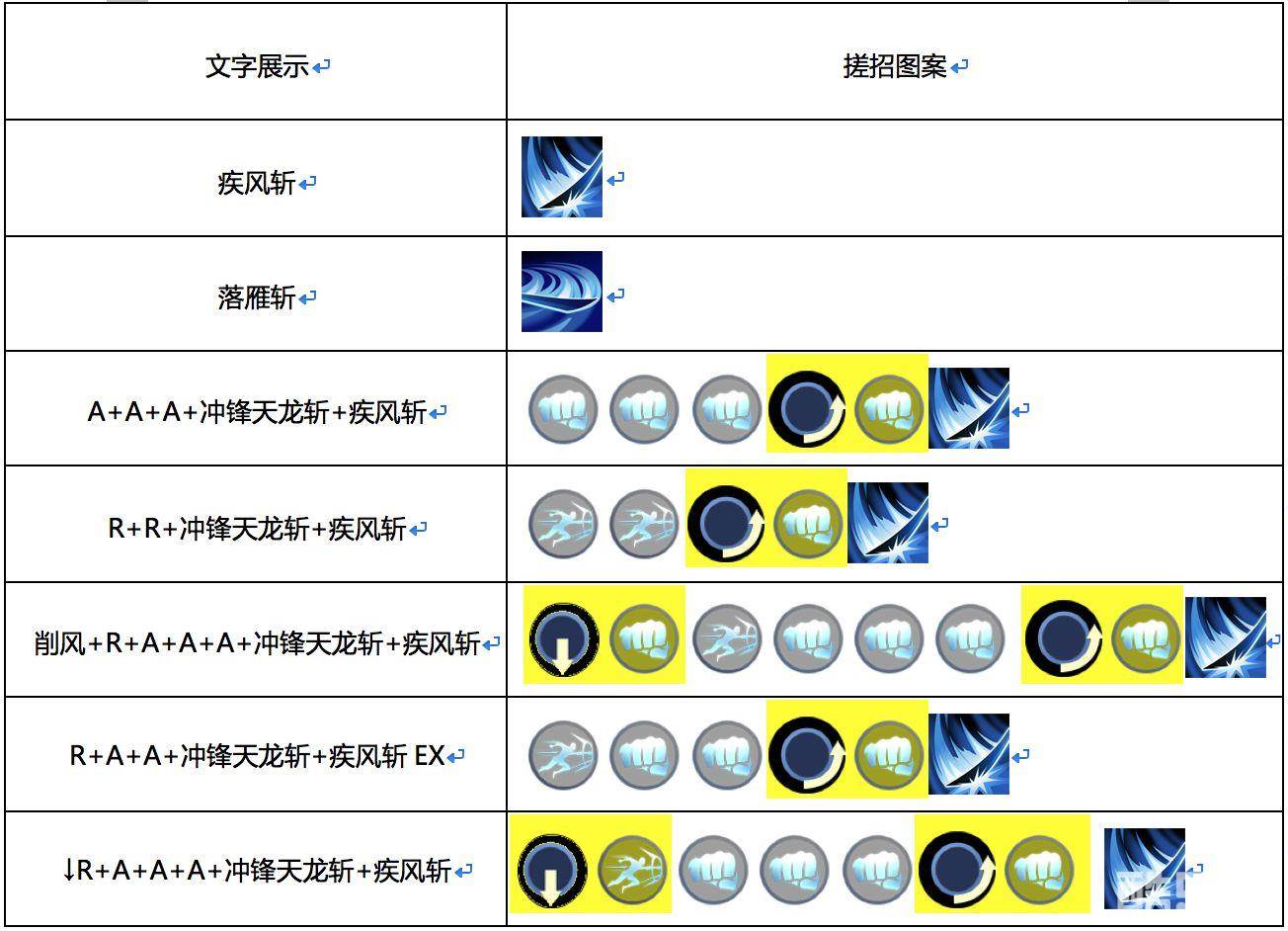 图表中【拳头】=A、 【冲刺】=R、 图标连起高亮代表搓招。