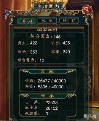 玩家在前期主要进行征收和征粮,并且使用元宝将银库和粮库进行升级,当金钱和粮食都收集到150000的时候进行大规模的征兵,然后就可以向外进行扩张了。越到后面,随着妃子技能开启,后宫建造,赐花翎,凌烟阁大臣升级,珍宝获得,国力增长值越高。这是需要非常漫长的过程,玩家还是需要从基础开始建设。