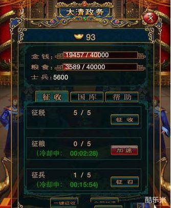征兵:玩家可以升级大臣的政治值决定每次征收银两的数量,冷却时间为30分钟。