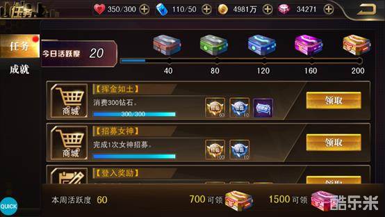 3.每天完成的活跃度可以累计解锁周活跃度奖励,满700活跃和1000活跃都可以领取丰厚奖励,更有高级召唤券等你来领噢!
