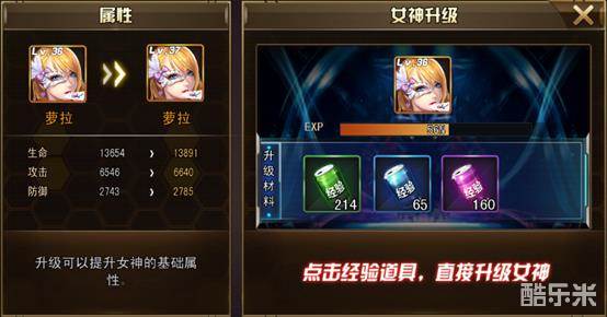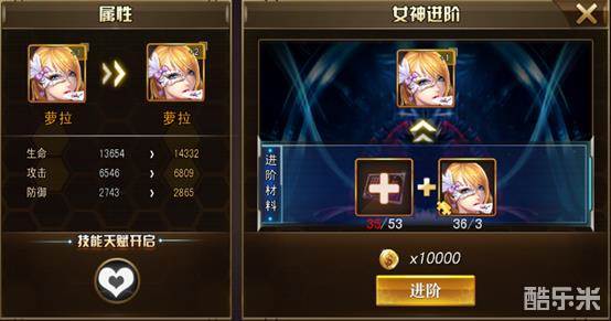 进阶,通过消耗进阶卡和对应女神碎片+金币进行进阶,进阶同时会开启对应的技能天赋