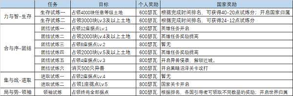 除此之外,完成试炼任务和占领据点将获得“试炼分”,试炼分会影响第四试炼——局与势-领袖的国家排名,排名越高,该国成员所获得的奖励越好。