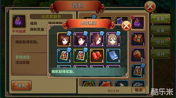 本巴豆妖的背包里面,会看到有一个紫色的包裹上闪烁着红色的点点。在背包界面中,如果物品可以使用或者碎片可以进行合成,会在物品图片的左上方出现红点的提示。巴豆妖点击了对应的图标,发现是今天刚刚领取的比武奖励包。对于这种包裹类的物品,在拥有数量的旁边会有一个放大镜的图标。点击对应的图标可以看到该包裹打开后有可能获得的东西。点击左下角的使用图标,就可以打开这个包裹,看看里面到底有什么了。