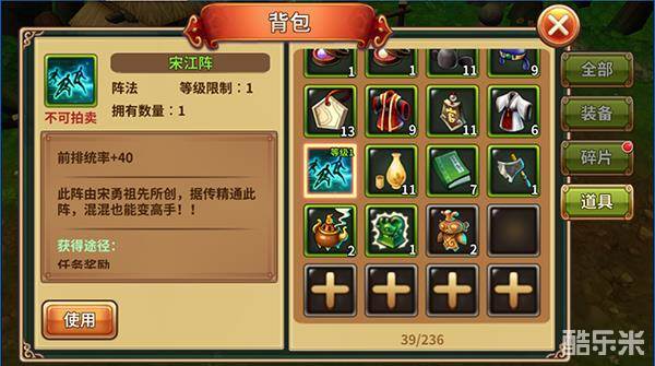 在背包界面中,点击道具就能够在左侧看到道具的名称、等级限制、拥有数量、道具效果、道具描述、以及获得途径。点击左下方的使用即可使用道具。当道具不能够直接使用时。点击使用图标会跳转到道具使用的位置。例如,当你使用功勋丹时,会跳转到加官进爵的界面中。