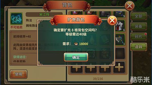 本巴豆妖已经40级了,开始进行40级的扩容。扩容时,系统会提示各位本次扩容的等级需求和铜币需求。点击确定就可以完成背包扩容了。