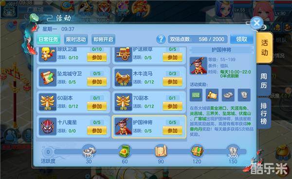 护国神将是《天书奇谈》里的高难度玩法,需要至少55级才能进行挑战,每天的开放时间是早上10点到晚上10点,需要组队才能开启。而且护国神将还分为10个等级,等级越高奖励越丰厚,但是难度也越来越高。所以要通过护国神将非常需要明确的指挥。