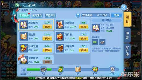 历练任务建议每天必做,每天一共20轮,完成后可获得大量经验和银两,而且奖励是随着人物等级提升而提升,这就是为什么级别越高越要完成的。历练任务是不限时段、单人即可完成,点击右上角‘活动’即可参加。