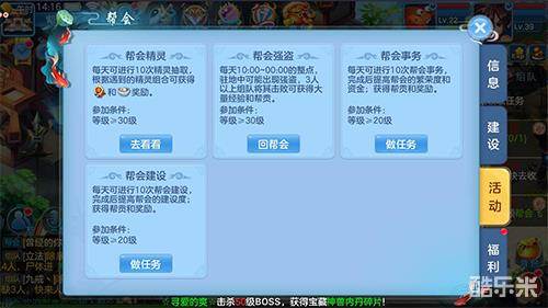 玩家在25级后就能加入帮会,和帮会成员一起任务也会有额外经验,点击活动页面中‘帮会精灵’即可开始帮会任务,帮会任务分为:帮会精灵、帮会强盗、帮会事务和帮会建设。完成任务可获得大量经验、银两和帮贡,帮贡可以用来升级人物辅助技能。