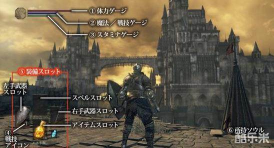 1、体力槽:代表生命值,归零时则死亡。可以通过回到篝火边上、或是元素瓶等道具回复