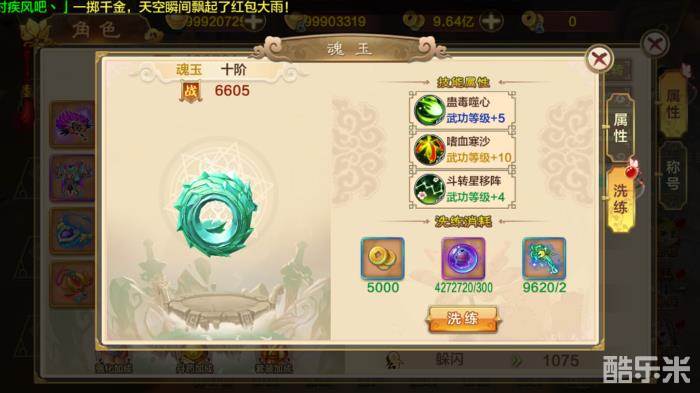 魂玉洗炼是在魂玉最核心的功能,通过洗炼魂玉可以强化本职业已学习的任意三个技能,最低强化1级,最高十级,通过不停的洗炼来力求洗到自己想要的技能,并且强化等级可以更高。