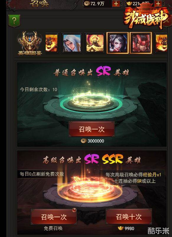普通召唤消耗金币,可召唤出SR英雄,高级召唤每日有一次免费机会,同时可消耗元宝进行额外召唤。高级召唤必出一定数量的经验丹,并且所有等级英雄均有机会获得,十连抽必出SSR及以上英雄。