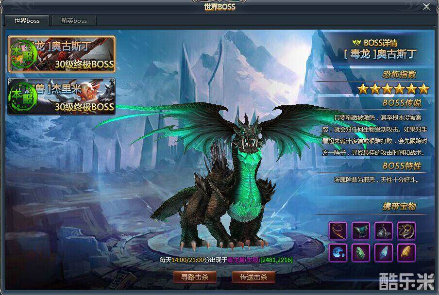 1. 每天14:00和21:00,在本服和跨服BOSS地图中刷新世界BOSS,可通过主界面上方的世界BOSS图标打开查看刷新情况。