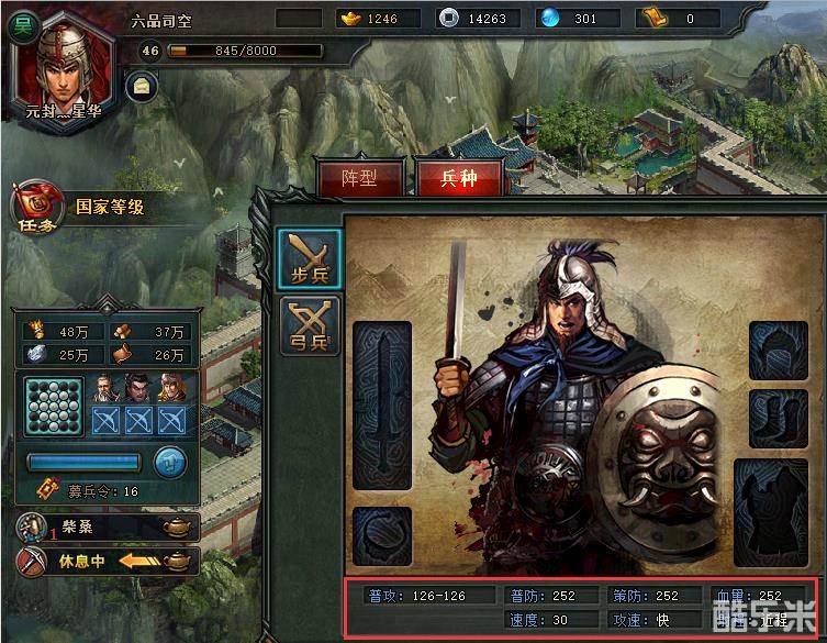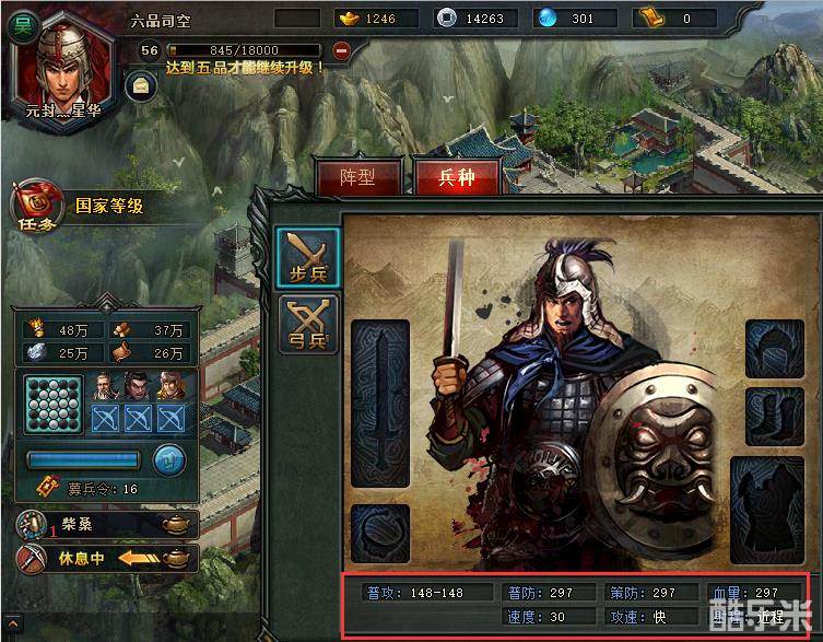 上图是46级玩家的步兵属性,同样情况下观察56级时的属性,就可以看出全属性都明显提高了!