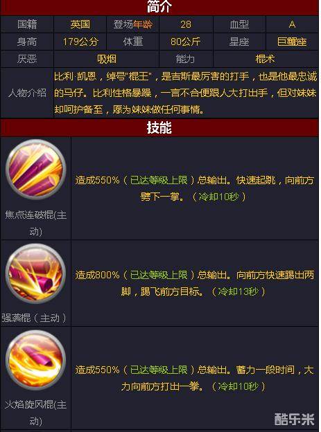 比利是拳皇命运手游中的使用棍术的角色,那么在拳皇命运手游中比利怎么样?比利厉害吗?比利有什么技能?一起来看看拳皇命运手游比利技能能力的图鉴吧。【比利图鉴】