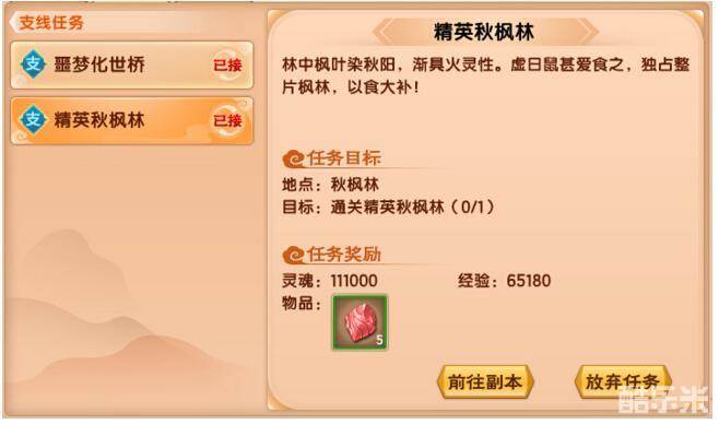 造梦西游5通关主线副本秋枫林后开启,精英副本每天都有2次的免费挑战次数。