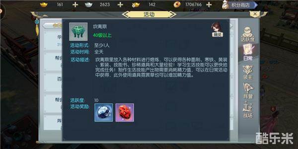 每天5:00刷新次数,每次鼎需要六样材料作为必需品来开启坎离鼎,由于坎离鼎能够产出许多珍稀宝贵的物品,像是紫装、彩霞、技能碎片等等,是许多玩家钟爱的活动之一。