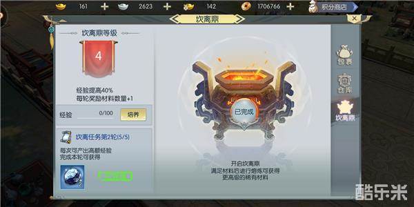 最后,坎离鼎本身提供的经验可以提升,但每次提升的幅度不大,玩家可以量力而行,去杂货铺买指定材料就可以进行升级。