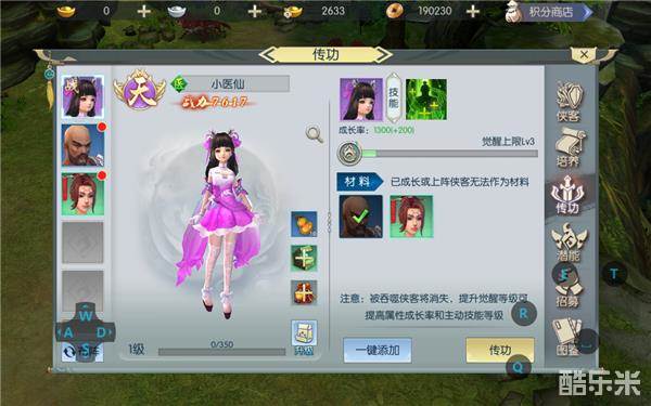 侠客可以用低品质的材料侠客来进行传功(类似吞噬),传功后侠客会获得一定的传功进度条,进度条满以后侠客会进行觉醒,觉醒后侠客的成长率会随之而提升,并且会提升侠客的主动技能等级。