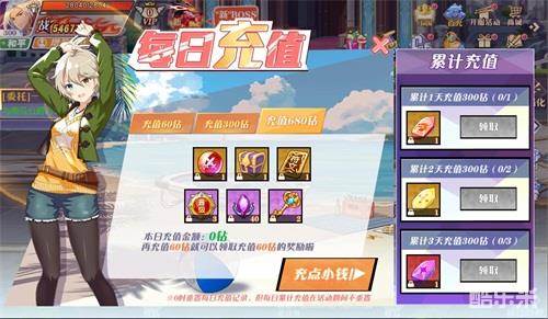 活动期间内,每当大人您充值达60钻、300钻、680钻时,都能领到神兵精华、首领疲劳药水、首领挑战券、装备寻宝钥匙、符文寻宝令、镶嵌宝石、符文精华宝箱、晋级令等道具。当大人您累计1天、2天、3天充值300钻时,都可以获得橙色到红色的顶级神兵道具!