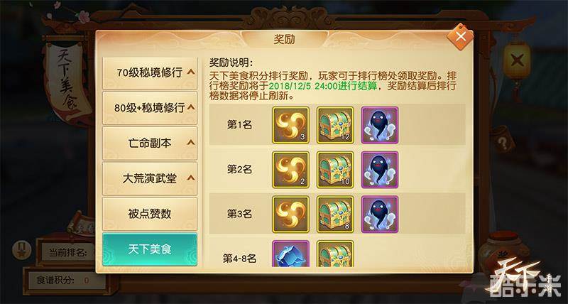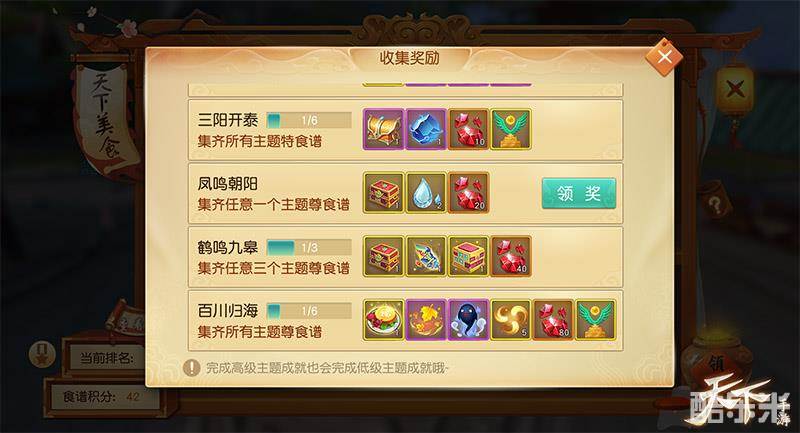 蒸羊羔、蒸熊掌、蒸鹿尾儿、烧花鸭、烧雏鸡、烧子鹅,听到这些菜名是不是肚子已经饿的咕咕叫了呢。没关系,“天下美食”活动正式登陆大荒,为你而准备一桌满汉全席,小心口水流一地噢。六大主题三大品质,哪道美味才是你的最爱?参加活动不但可以品尝美食,按要求集齐食谱还可获得珍贵道具,包括个性时装、限定聊天框和精美空间装饰噢。除此之外,更有机会获得稀有陆尘和击杀印记,就是这么酷炫。偷偷告诉你,开启玉馔食珍宝箱和玲珑食珍宝箱可以获得食谱宝箱或兑换券,还不快去商城抢购!对了对了,收集食谱还可获得积分,排行榜前列的少侠将获得额外奖励,快去寻找藏在大荒的食谱吧!
