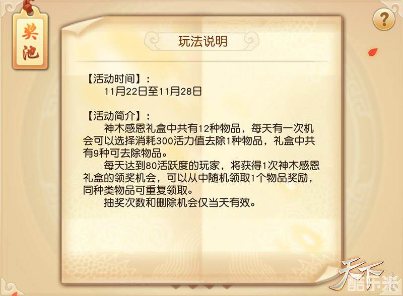 非酋附体,衰气缠身?是时候改变下自己的运气啦,转发这颗幸运星,大奖等你带回家!活动期间,每日达到80活跃度即可领取神木感恩礼盒,内含十二个珍贵道具,包括火鸡大餐和雷音溟钻等,开启礼盒后就可以随机获取其中一个啦。而且各位少侠每天将有一次机会,选择使用活力值去除一个不中意的道具,提高你中大奖的几率,这次非酋变欧皇!