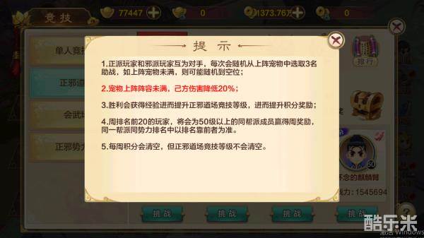 每次战斗时,玩家都会从自己的上阵宠物中随机选取3个出战。若宠物上阵阵容未满,则己方攻击力会下降20%.并且可能会在对战时出现宠物空缺的情况。每周积分结算时,排名靠前的玩家还可以为自己的帮派成员赢得额外的奖励哦!