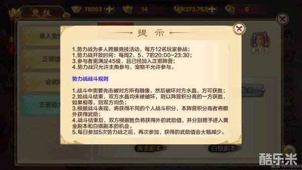 正邪势力战是游戏中的一个实时多人PVP玩法。当玩家45级时可以开启正邪势力战,每周二、周五、周日的20:00-23:30开启。正邪势力战是一个12V12的多人PVP玩法,在战斗中,玩家需要以击杀对方势力的NPC、玩家;并摧毁敌方防御塔及水晶来取得胜利。