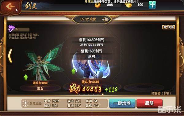 剑灵培养:花费剑气进行培养,培养的效果是升级剑灵等级,剑灵等级提升将会增加剑灵基础属性;