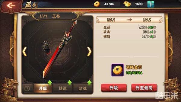 宝剑升级:每次升级消耗一定的铜币,升级成功后宝剑属性提升,宝剑最高可以与角色同等级。