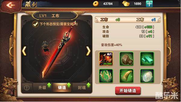 宝剑铸造:集齐6个铸造材料可完成一次铸造,提升宝剑属性,每个材料镶嵌后都可以为宝剑增加一定的属性值,当宝剑铸造达到一定等级后,宝剑的特效表现发生改变,会变的更好看。