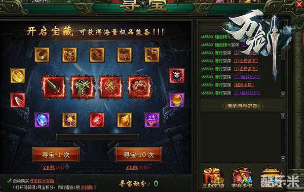3、玩家每次寻宝都将获得寻宝积分,利用积分可以在兑换商城中兑换多种属性宝石、功力丹、百万银票等物品。
