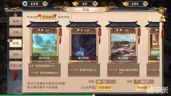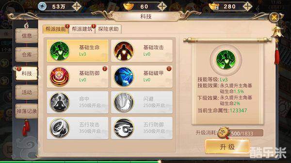 使用个人贡献点,升级帮派技能,附加属性大增