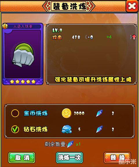 2.装备洗炼分为两种,金币洗炼和钻石洗炼,钻石洗炼可以获得更好的提升效果
