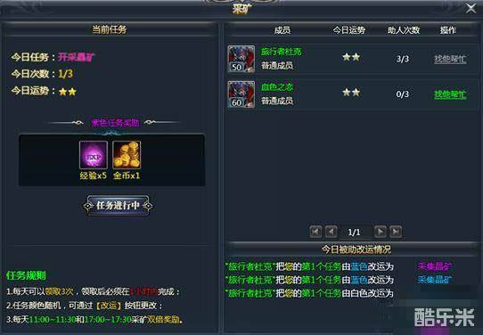 采矿任务分为白、绿、蓝、紫、橙五种颜色,对当前领取的采矿任务颜色品质不满意的时候,可以邀请公会内其他玩家帮忙改运,每位公会成员的帮改次数为3次。