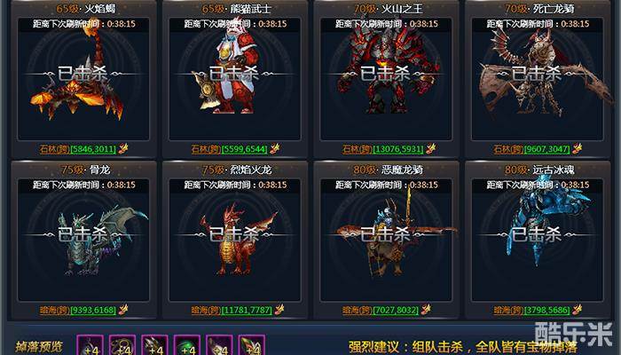打开精英BOSS活动图标,即可显示精英BOSS的刷新和击杀情况,击杀精英BOSS会随机掉落坐骑装备、圣翼装备等稀有进阶道具装备。这么丰厚的奖励自然也吸引了众多冒险者的继续,建议组队前往。