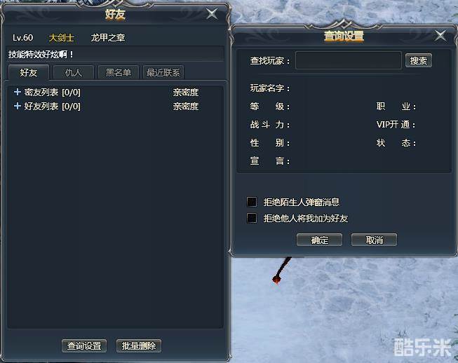 1.好友界面中的查询设置,输入玩家名字可以查找并添加好友,还可以设置拒绝陌生人弹窗信息和拒绝他人的好友申请。