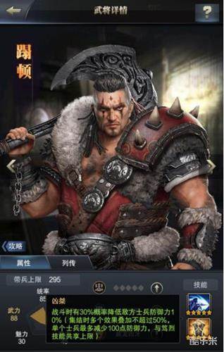 值得关注的是,蹋顿在紫授金章升阶为橙将后,会获得与神将太史慈一样效果的技能——“凶桀”,即战斗时有30%概率降低敌方士兵防御力10%。虽说只有30%概率生效,但是能大幅降低敌方军团的防御,作为一个紫将,获取成本较低,紫绶金章后的性价比还是非常高的。