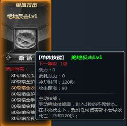 80级暗金技能绝地反击:手动释放技能后,进入3秒不死状态,在不死状态下,受到任何伤害都不会导致死亡,冷却120秒。