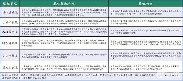 主要套路有六种(也许还有更多,等你们发掘):核心爆破流、区域平推流、人海掠夺流、暗杀偷塔流、定点平推流、巨人输出流等,每个流派的搭配方式以及特色如下。