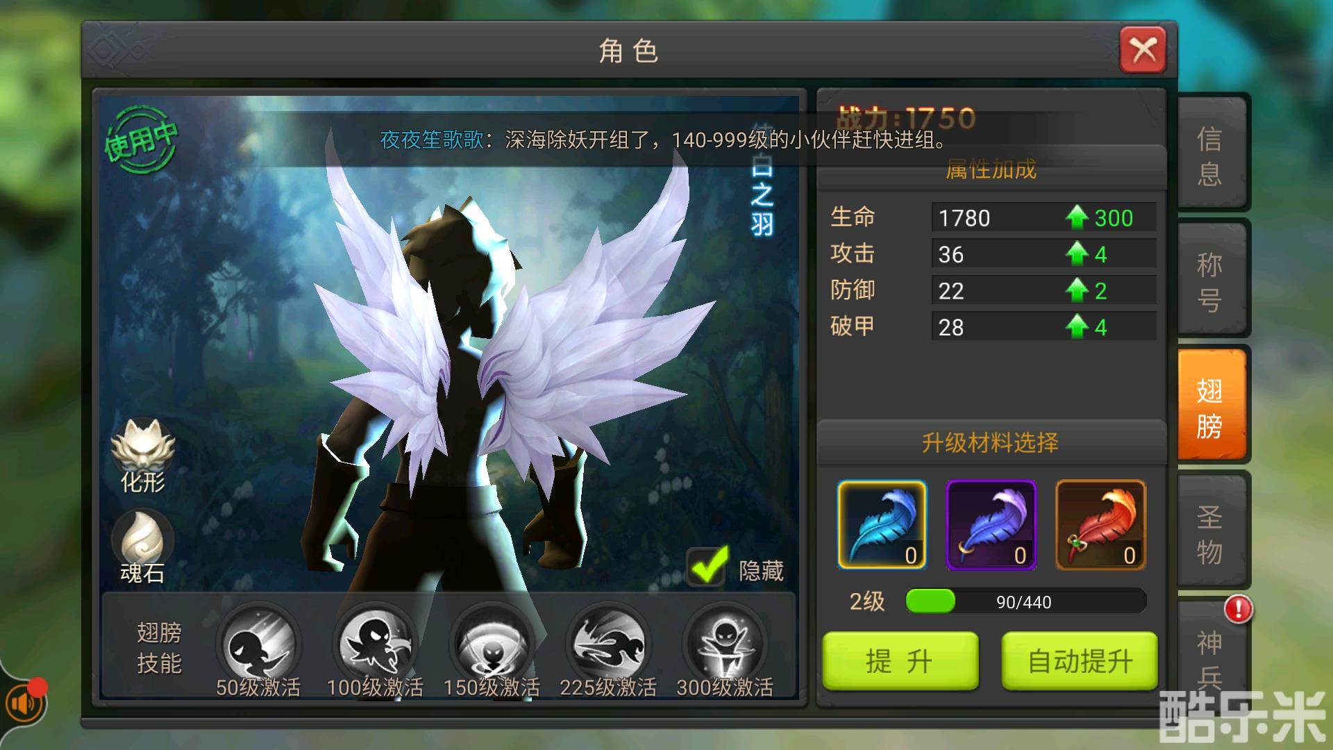 翅膀的升级需要经验,经验来源于三种不同颜色的羽毛,只需要选择对应的羽毛而后点击提升或者自动提升即可。