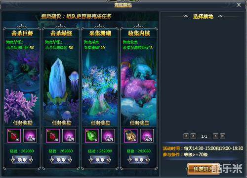 海底禁地在每天的14:30-15:00和19:00-19:30这两个时间段开启。一共有3个房间,玩家可以自行选择。一共有四个任务可以接取,一个队伍的玩家一定要进入同一个房间。