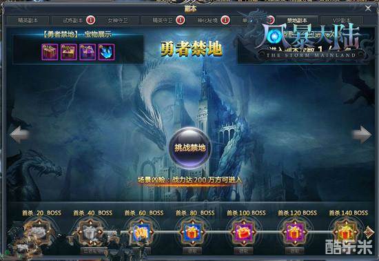 《风暴大陆》勇者禁地副本中,玩家们首杀20boss、40boss、60boss、80boss、100boss、120boss、140boss等等都有首杀礼包。