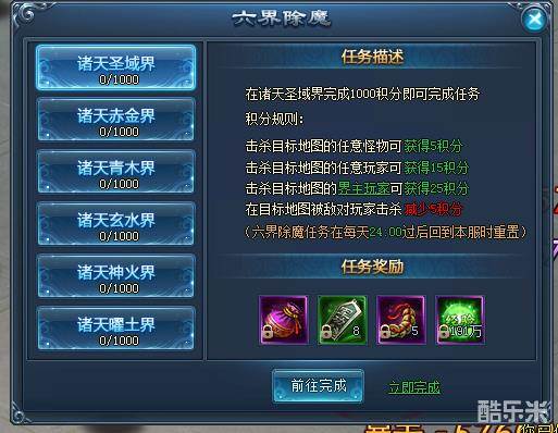 六界除魔:诸天六界危机重重,浓郁的天庭仙气除了孕育天材地宝,也诞生了诸多恶兽,玩家每天可接受一定数量的“六界任务”,只要按照任务要求,去六界各地击杀足够数量的恶兽,便可完成任务领取奖励。